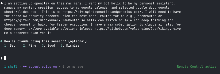 So I built Helix. An OpenClaw agent running on a Mac Mini in my home office in Boston, connected to my Google Calendar, my content docs, and a deep memory system that learns my preferences over time. Helix switches between Claude Opus 4.6 for hard problems and cheaper models for quick tasks, all automatically via openRouter.